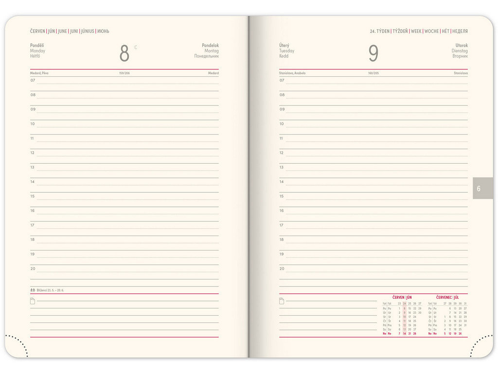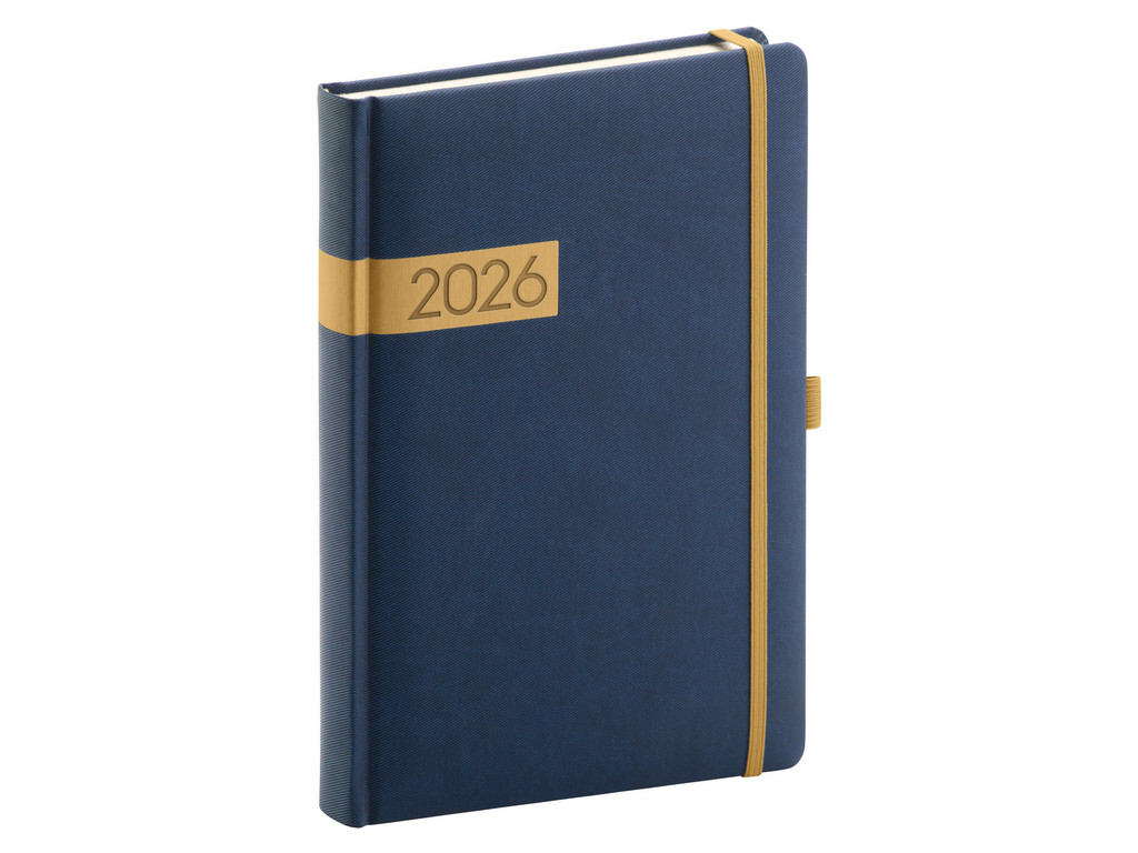 Denní diář Twill 2026 v modré barvě. Osvědčené barvy doplňuje ražba letopočtu. Denní rozvrh s česko-slovenským kalendáriem a doplňkovou angličtinou, němčinou, maďarštinou a ruštinou.