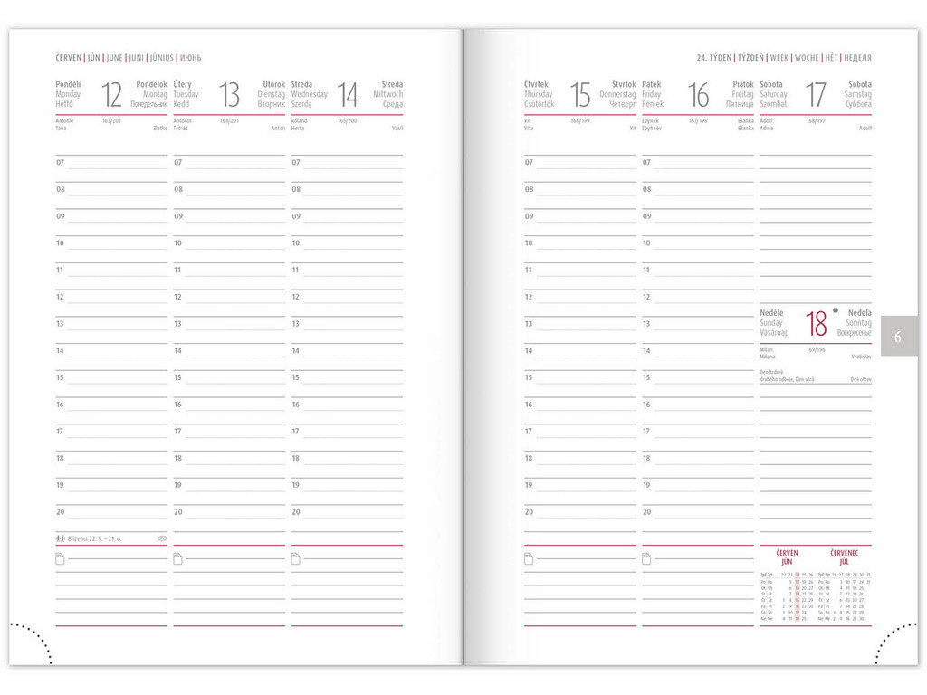 Týdenní diář Vivella Classic 2023 v klasické hnědé barvě s dominantní ražbou letopočtu. Povrch diáře je imitací kůže. Týdenní rozvrh s česko-slovenským kalendáriem a doplňkovou angličtinou, němčinou, maďarštinou a ruštinou.