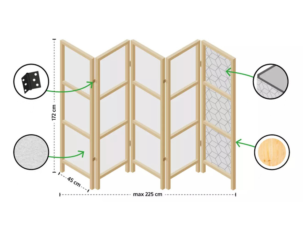 Elegantní dřevěný paraván Fabulo je praktickým řešením pro vizuální předělení prostoru. Ideálně se hodí do wellness center, salónů, jógových studií, hotelových pokojů, nebo jako stylový doplněk do domácnosti.