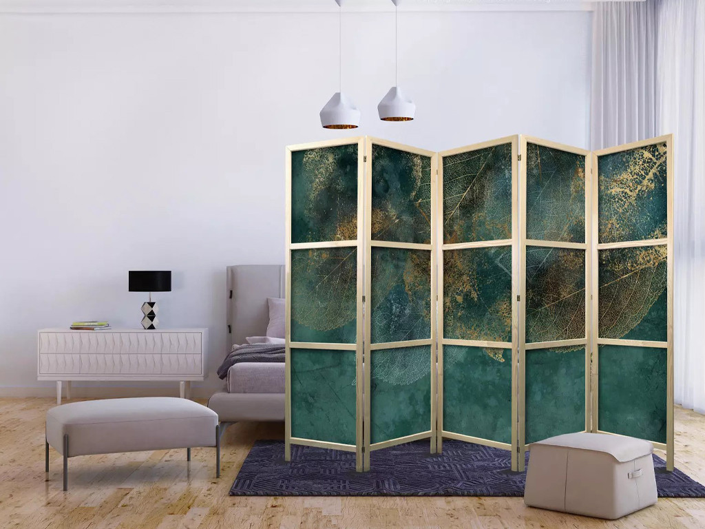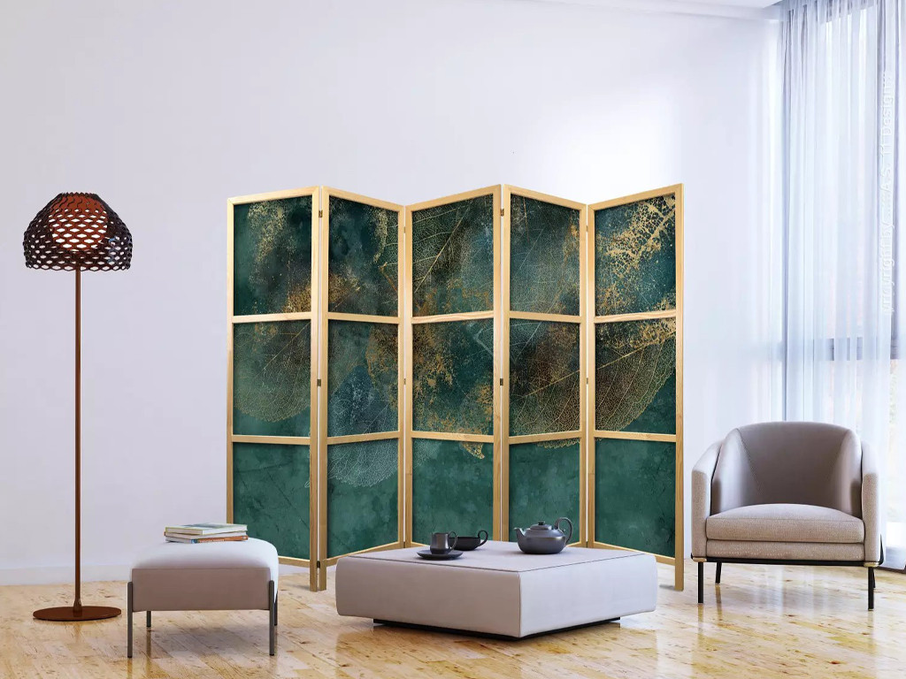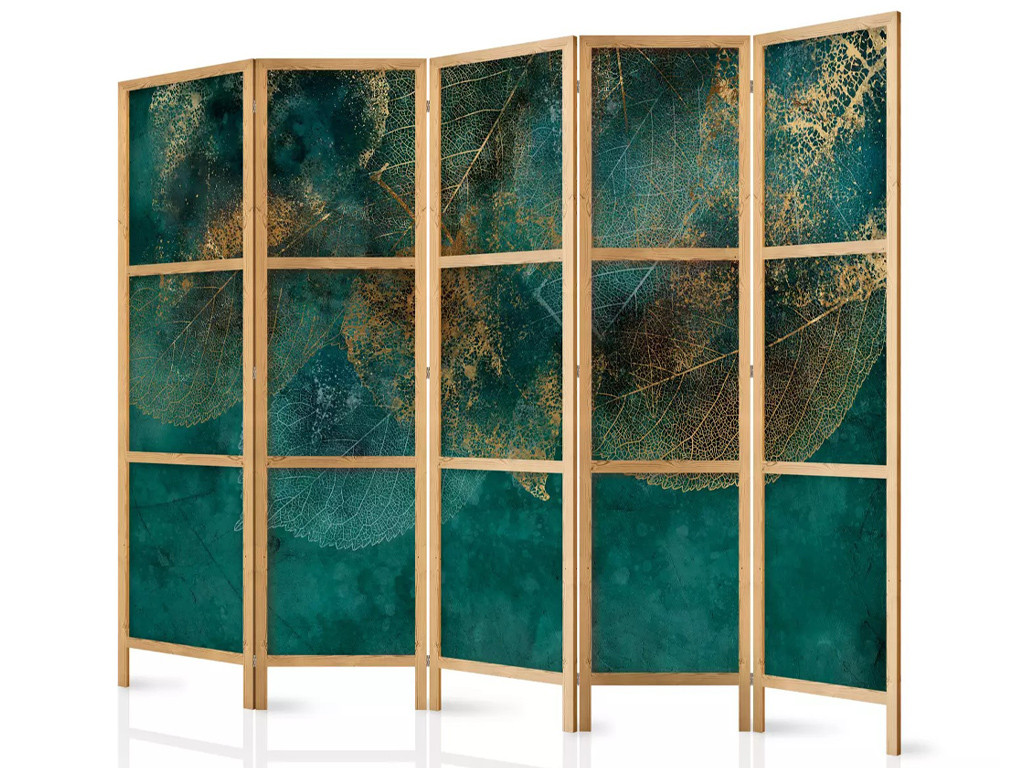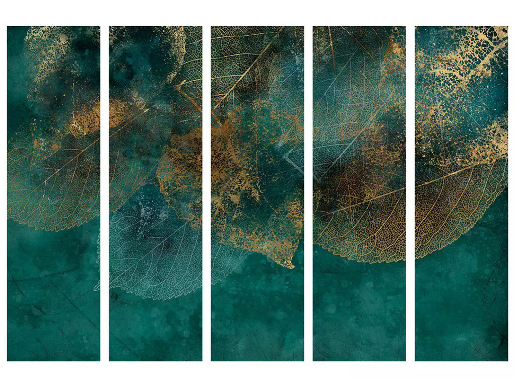 Dřevěný paraván Fabulo 5-dílný - Zlaté listy 172 x 225 cm | potisk na jedné straně paravánu