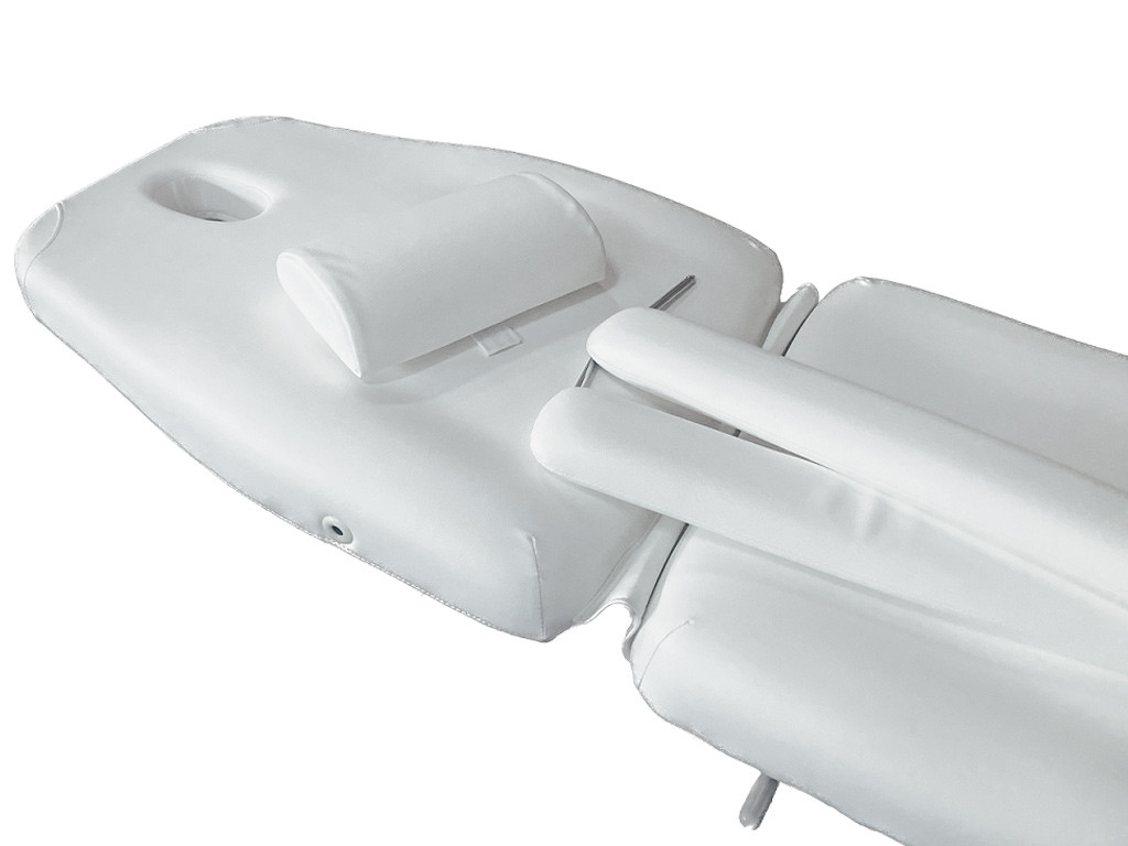 K pohodlí při provádění kosmetických výkonů, ošetření těla, masáží a wellness procedur přispívají i loketní opěrky, které se přizpůsobují poloze kosmetického křesla. Součástí výbavy je také otvor na obličej se zátkou.