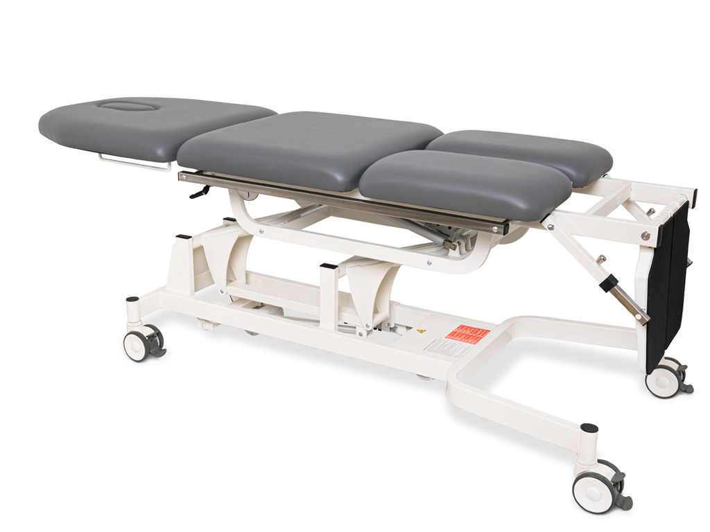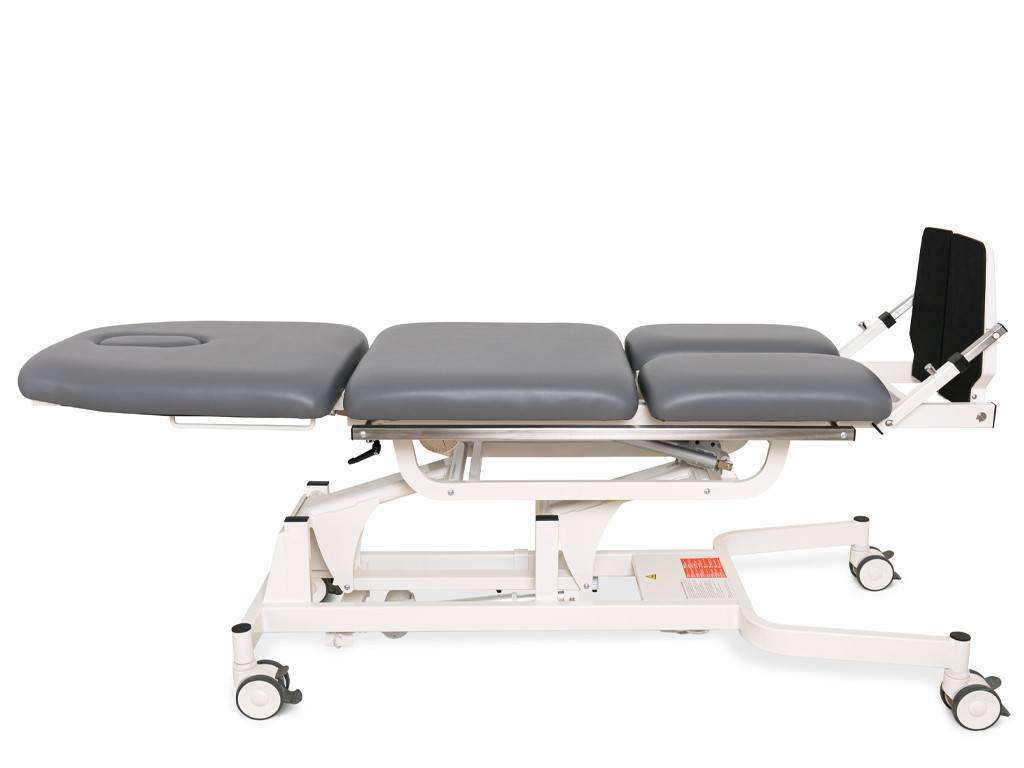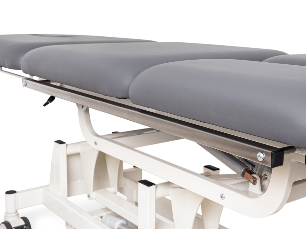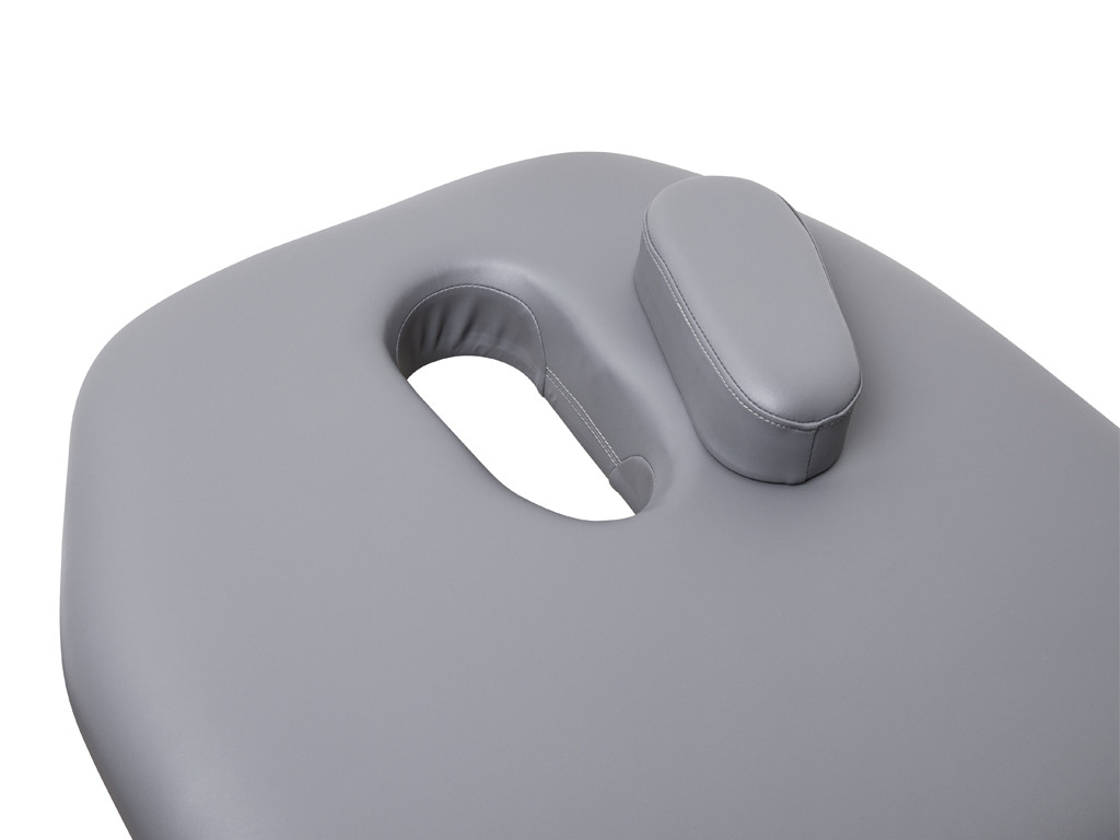 Třídílná plocha na ležení s nezávislými segmenty poskytuje optimální oporu celého těla a umožňuje ergonomické nastavení podle potřeb každého uživatele. Měkké, anatomicky tvarované čalounění zaručuje vysoký komfort i při delší terapii, zatímco odolný povrch se snadno čistí a udržuje. V oblasti hlavy se nachází otvor na obličej, který zvyšuje pohodlí při polohování v poloze na břiše.