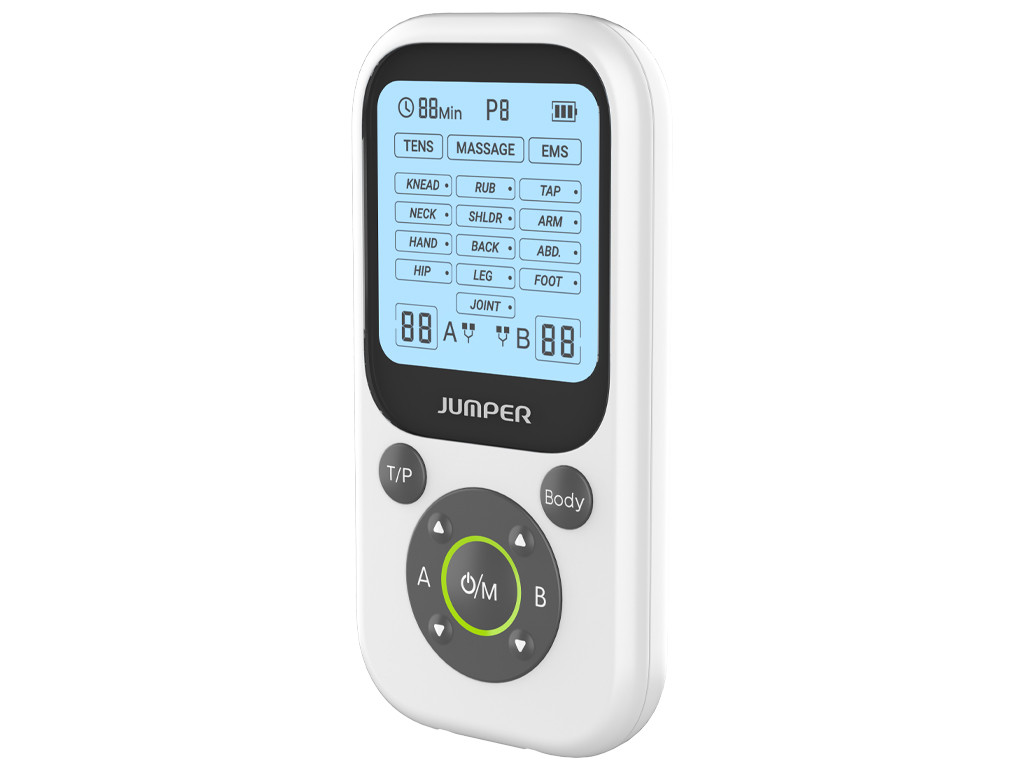 Elektrostimulační přístroj Jumper JPD‑ES210 poskytuje komplexní terapii díky režimům TENS (k úlevě od bolesti), EMS (ke stimulaci svalů) a MASÁŽ (k uvolnění a relaxaci). Disponuje dvoukanálovým výstupem, díky čemuž umožňuje nezávislou stimulaci dvou oblastí těla současně pomocí čtyř elektrod.