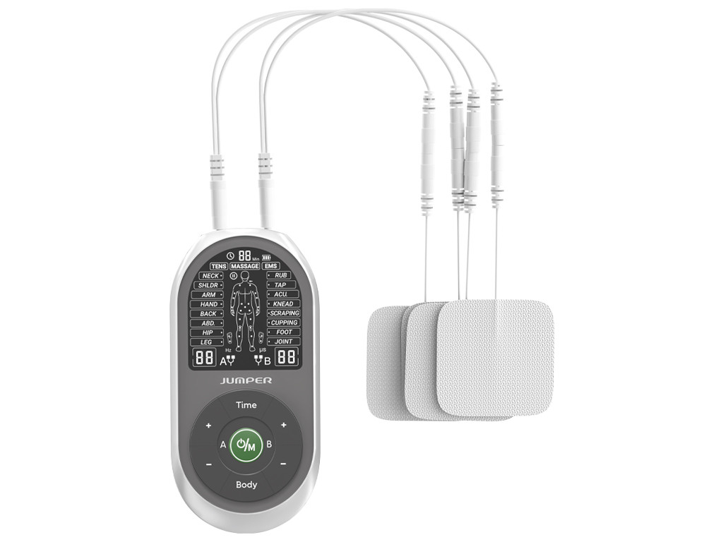 Elektrostimulační přístroj Jumper JPD‑ES230 je komplexní řešení pro domácí terapii díky trojkombinaci režimů TENS (k tlumení bolesti), EMS (ke stimulaci svalstva) a MASÁŽ (k uvolnění).