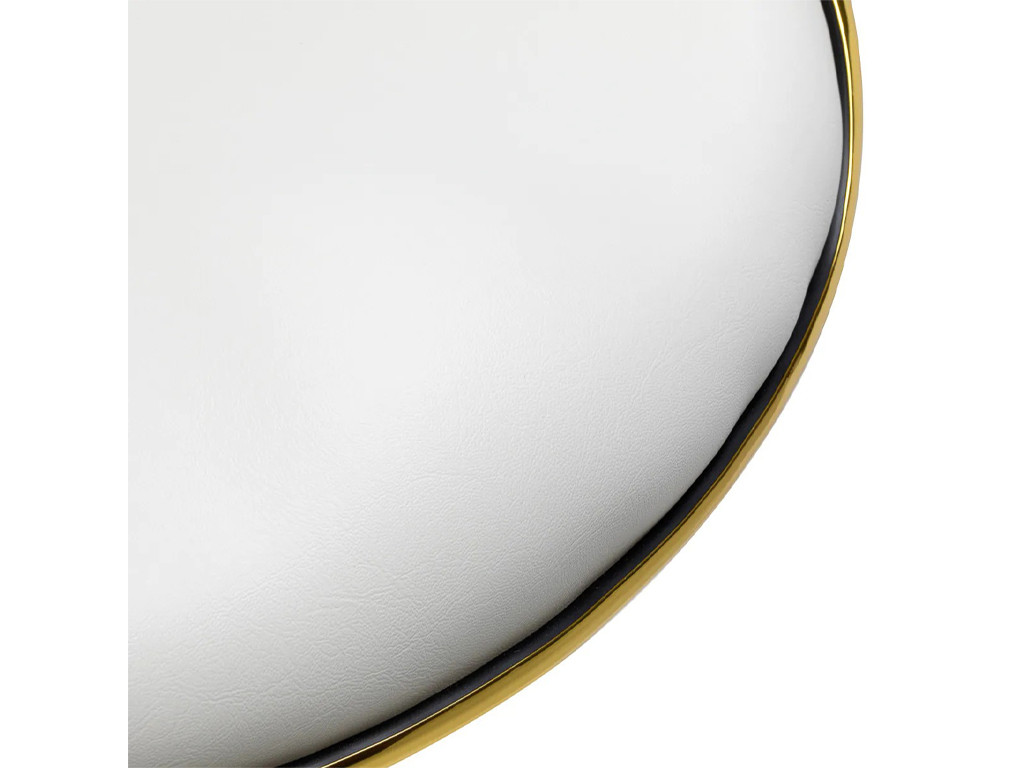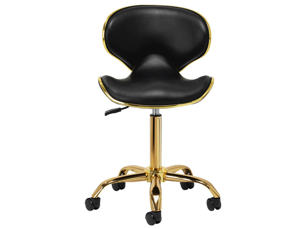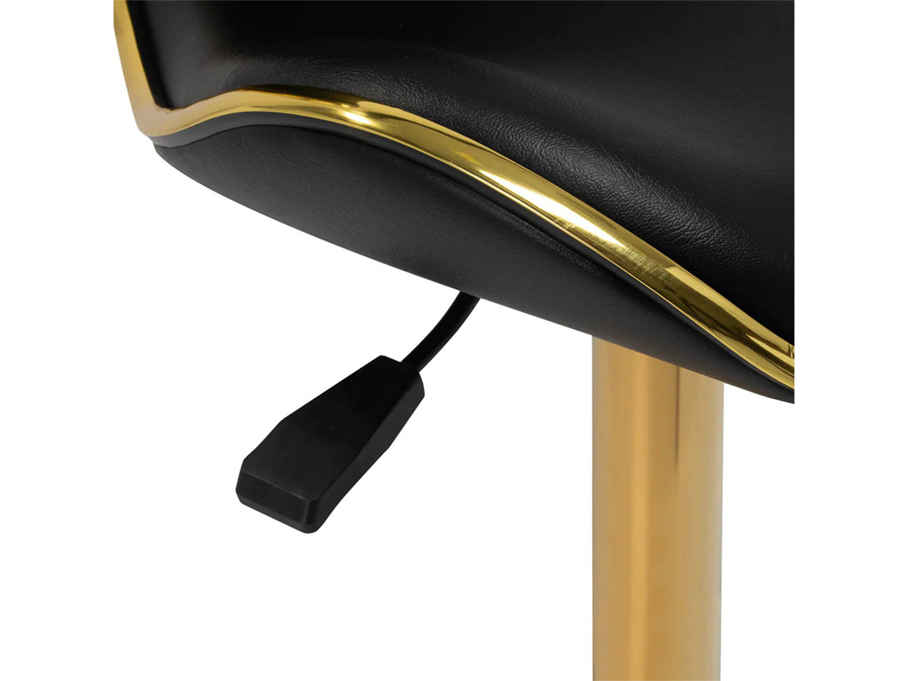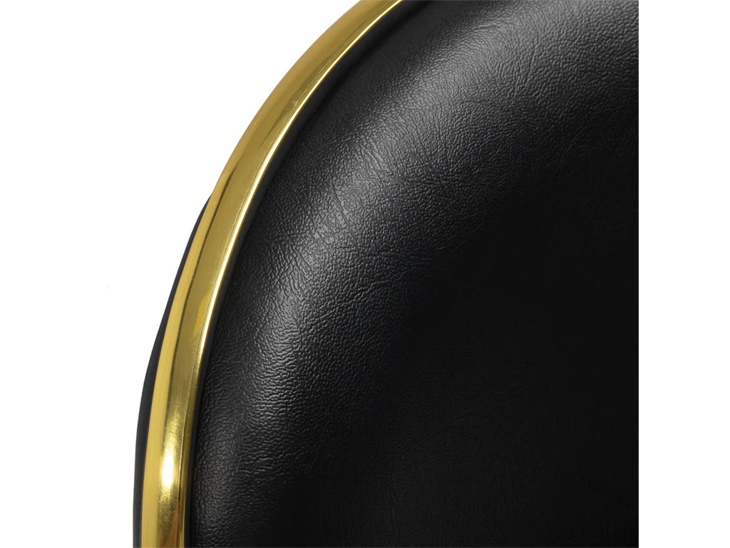Čalounění ze syntetické kůže je nejen příjemné na dotek, ale také odolné a nenáročné na údržbu. Design židle doplňují výrazně lakované zlaté prvky, které jí dodávají luxusní charakter a okamžitě upoutají pozornost klientů.