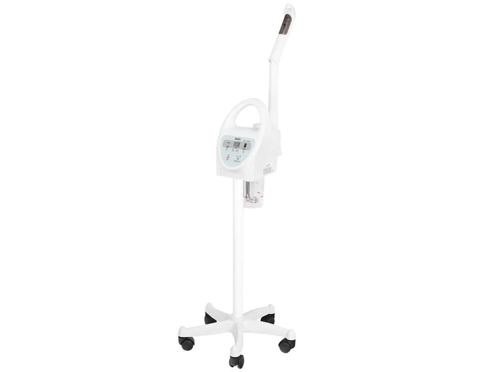 Multifunkční napařovač s horkou párou a ozonem, s nastavitelným časovačem a intenzitou páry. Napařovač je vybaven speciální parní hlavicí vybavenou kloubem, který umožňuje přesné nasměrování páry přímo na obličej klienta. Zařízení je umístěno na stabilním stojanu a má moderní design s podstavcem z nerezavějící oceli.