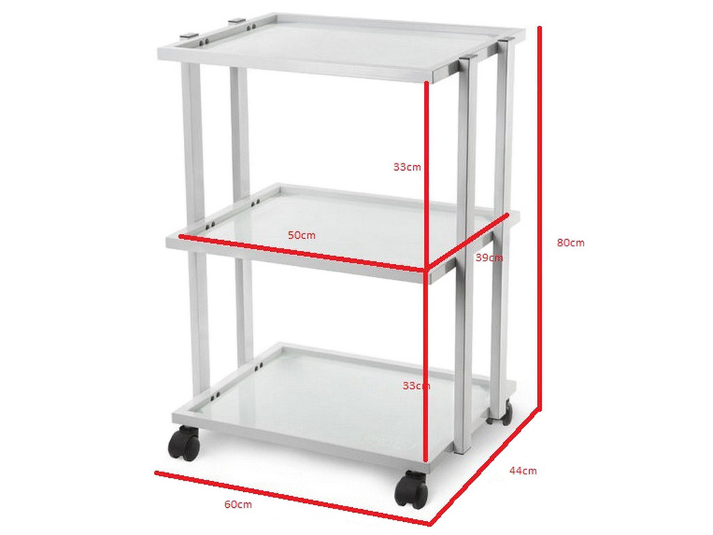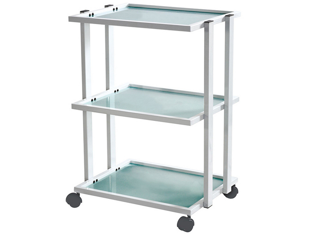 Kovový stolek 1041 je vybaven třemi poličkami s průsvitným sklem na ukládání kosmetických pomůcek a na připevnění kosmetických přístrojů a zařízení. Díky čtyřem kolečkům je kosmetický stolek plně mobilní a snadno se přemisťuje.
