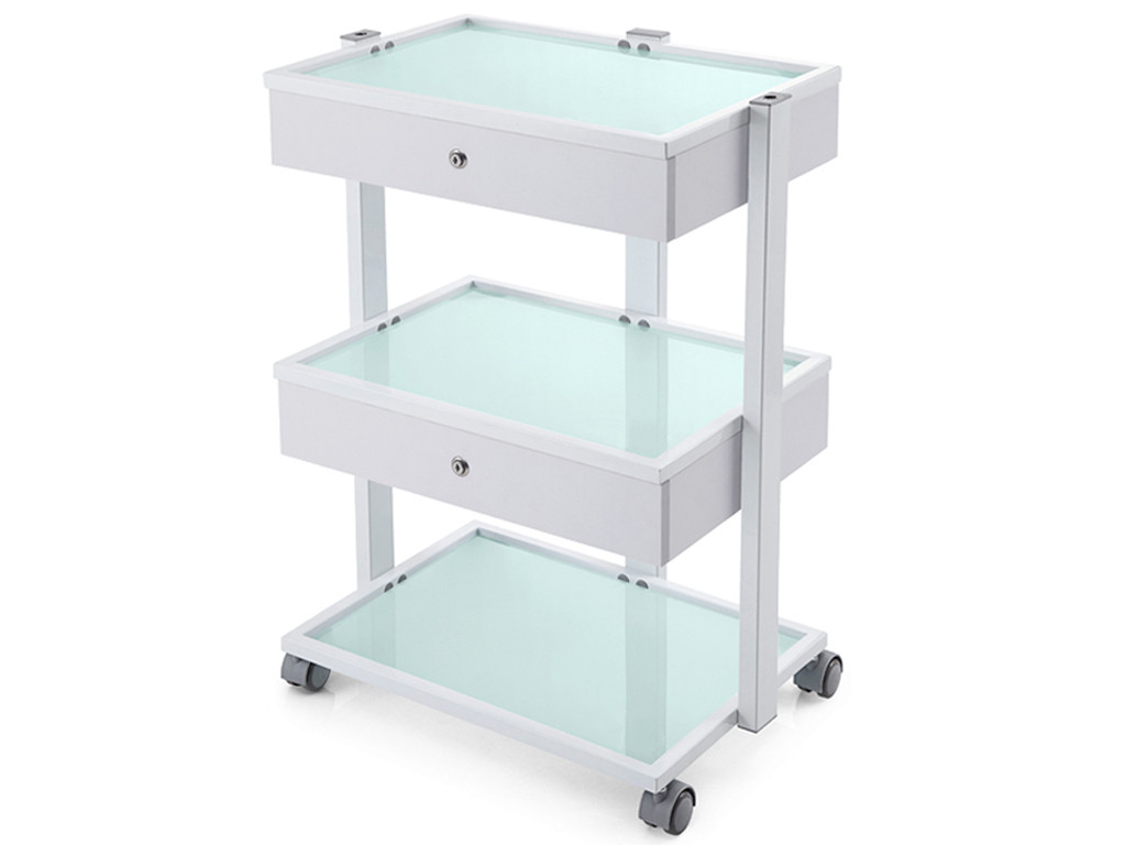 Díky otočným kolečkům je stolek snadno přesouvatelný, což umožňuje flexibilitu při práci v salónu. Je vhodný i do menších prostorů, přičemž nabízí dostatek úložného místa.