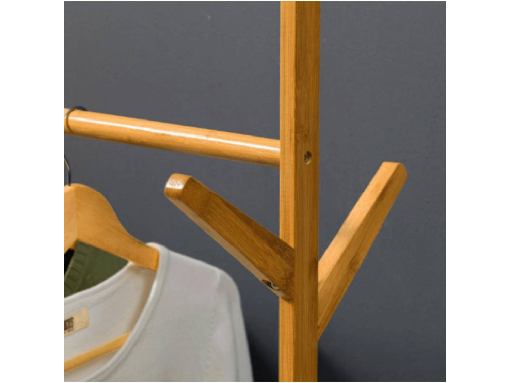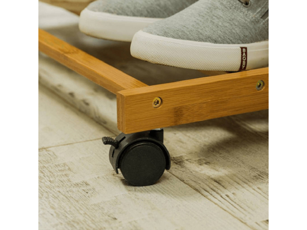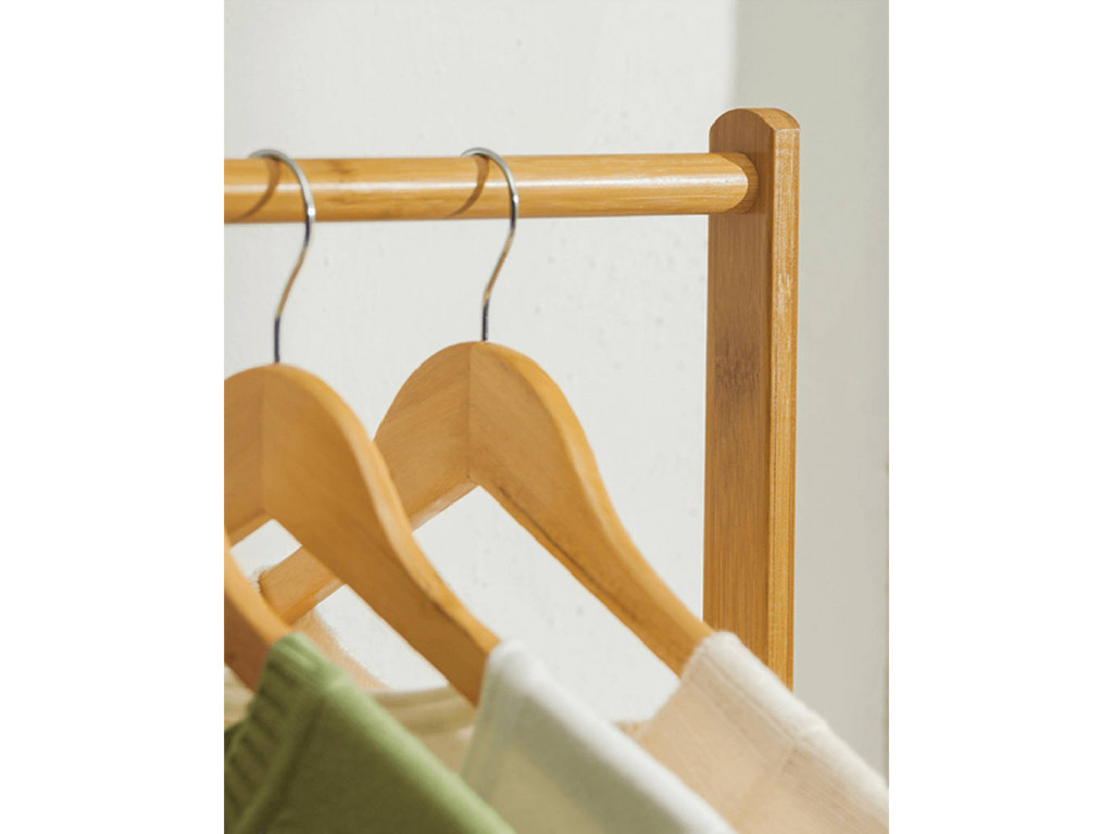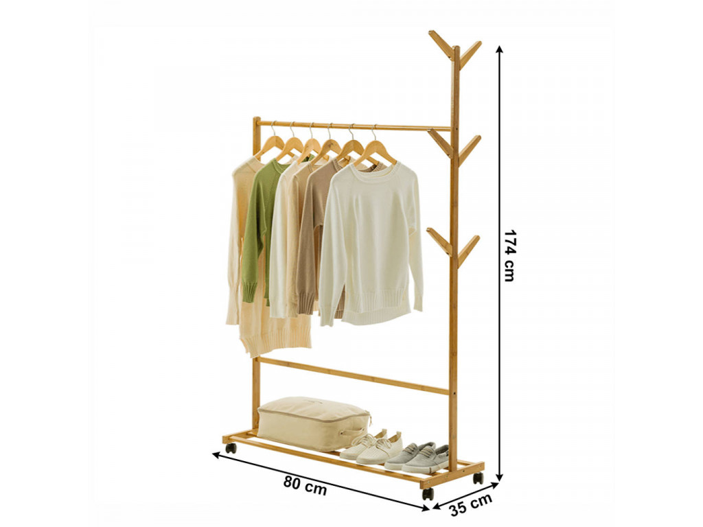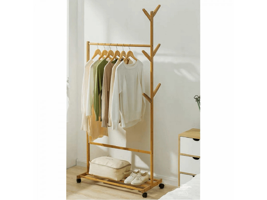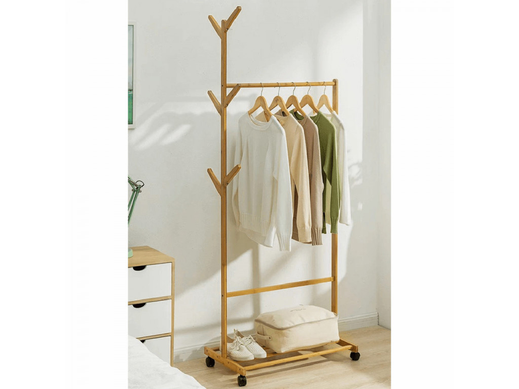 Pojízdný věšák VIKIR 2 je vybaven spodní bambusovou policí a věšákovou tyčí. Díky 6 háčkům na doplňky jednoduše uložíte i deštníky. Praktická kolečka dopomohou k plné mobilitě organizéru.