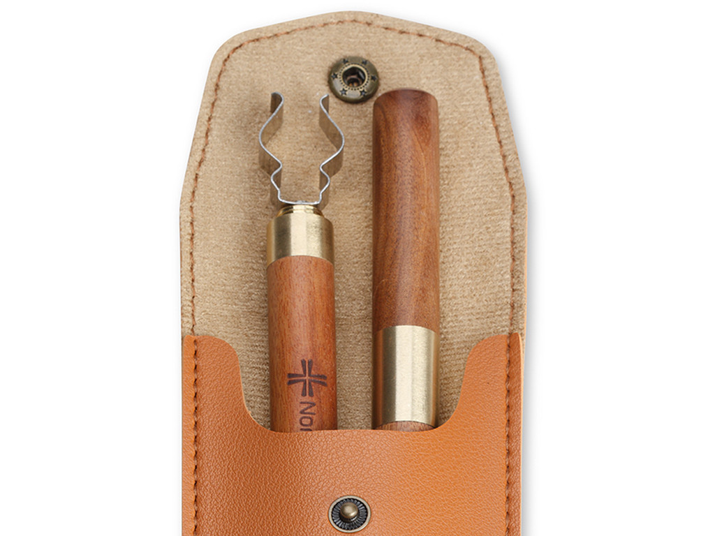 Obě pomůcky mají ergonomickou dřevěnou rukojeť a jsou uloženy ve stylovém pouzdře z recyklované kůže. Držák je vhodný pro moxové tyčinky s průměrem 1,5 až 1,7 cm. Škrabka má dřevěnou ochrannou krytku se závitem, která zajišťuje bezpečné používání a skladování.