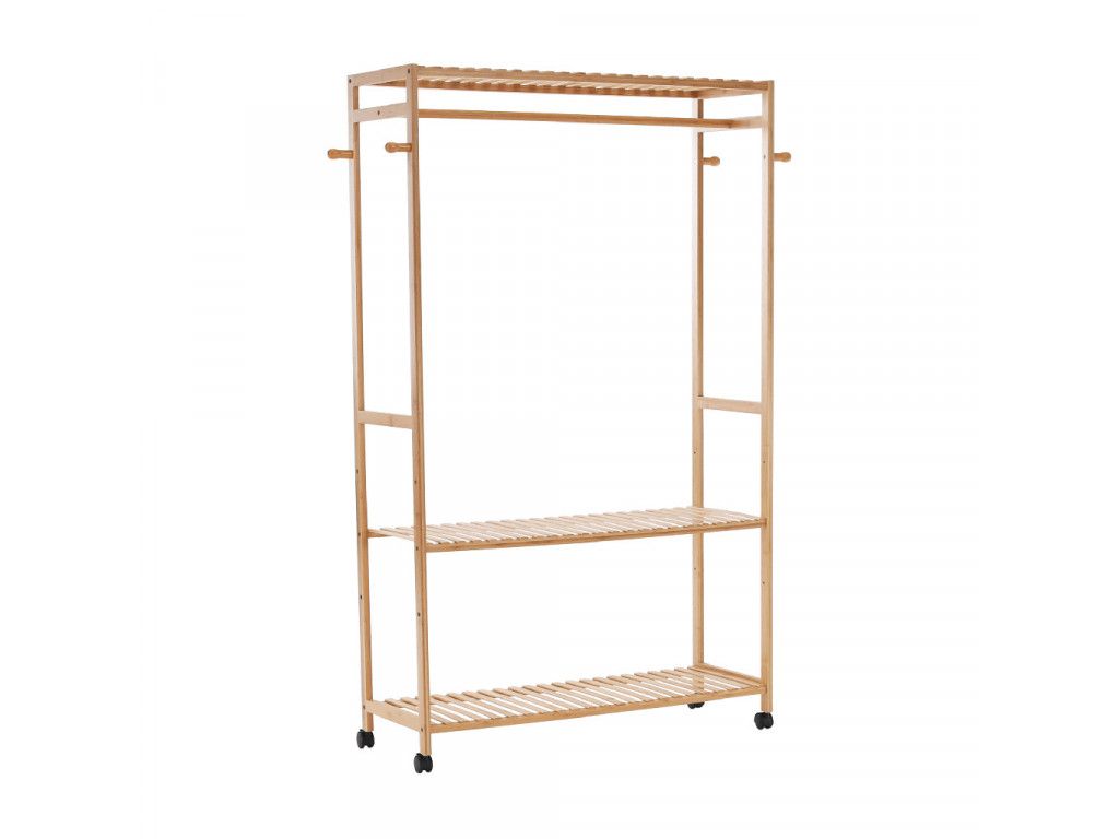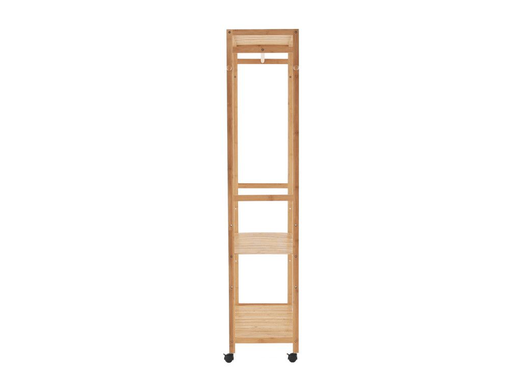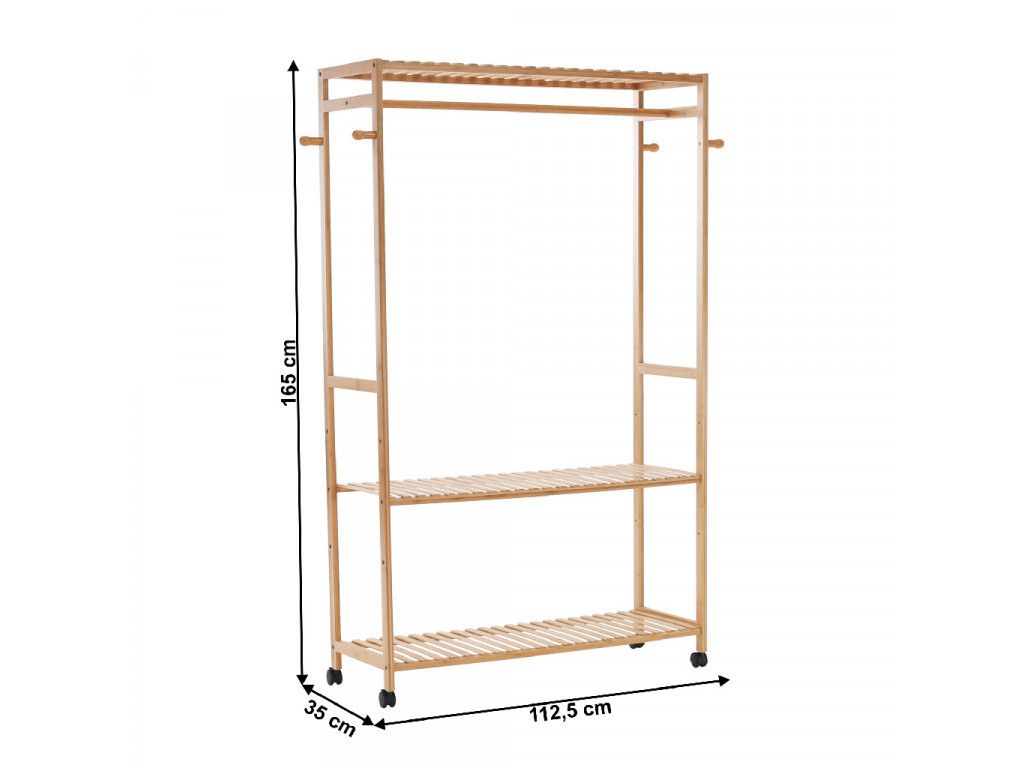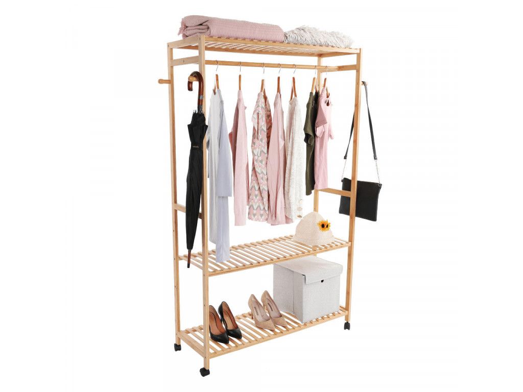 Šatní organizér MELAR je vybaven 3 bambusovými policemi a věšákovou tyčí. Díky 4 háčkům na doplňky jednoduše uložíte i deštníky. Praktická kolečka dopomohou k plné mobilitě organizéru.