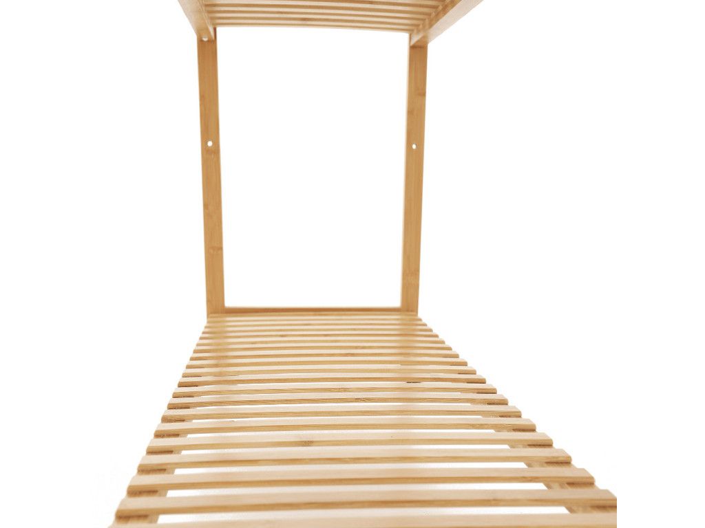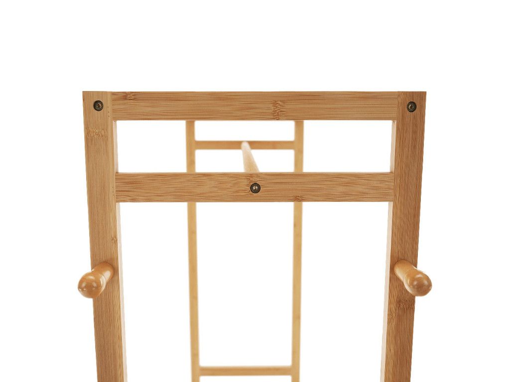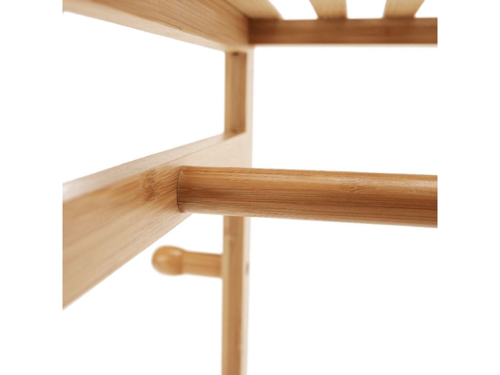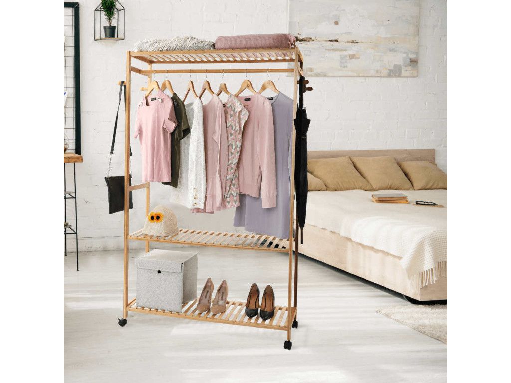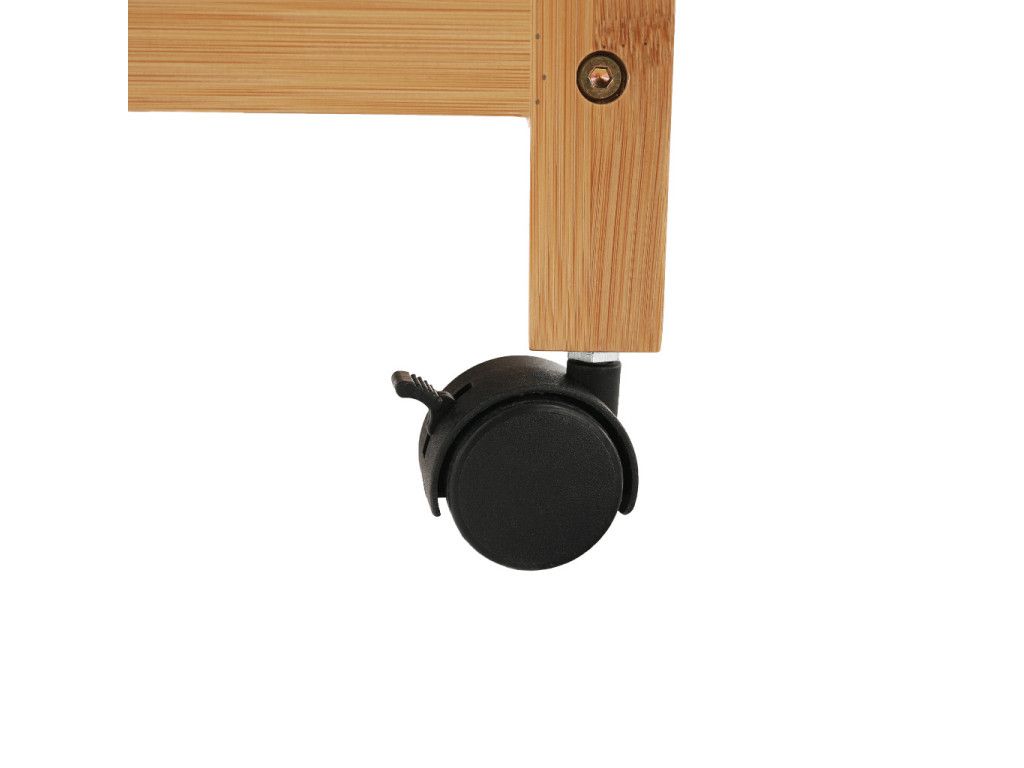 Šatní organizér MELAR je vybaven 3 bambusovými policemi a věšákovou tyčí. Díky 4 háčkům na doplňky jednoduše uložíte i deštníky. Praktická kolečka dopomohou k plné mobilitě organizéru.