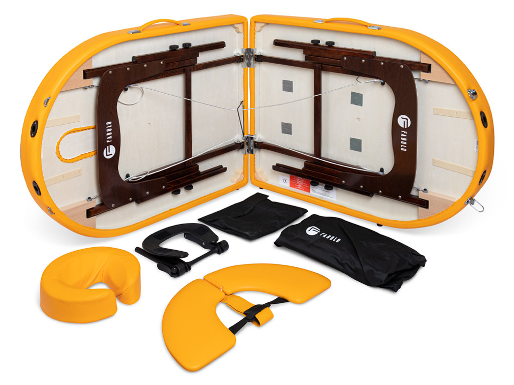 Profesionální dřevěné dvoudílné skládací masážní lehátko Fabulo Guru Oval Set je určeno především masérům, fyzioterapeutům a pracovníkům v oblasti beauty a wellness průmyslu. Přestože je masážní lehátko skládací, díky jeho stabilitě ho vřele doporučujeme i jako stabilní vybavení masážních salonů. Přenosné masážní lehátko Fabulo Guru Oval Set je velmi praktické, systém lanek zajišťuje jeho rychlé složení a rozložení, proto je vhodné pro maséry, kteří pravidelně cestují za zákazníky. Masážní lehátko dodáváme spolu s příslušenstvím, které lze uschovat uvnitř lehátka.