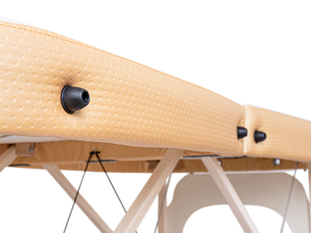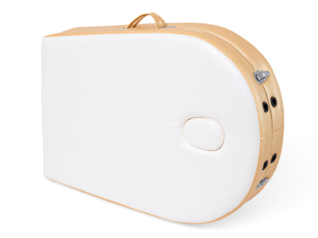 Komfort během celé terapie zajišťuje 5 cm silné polstrování potažené kvalitním PU čalouněním se strukturovaným povrchem, které je příjemné na dotek, odolné vůči masážním olejům a jednoduše udržovatelné. Praktický otvor na obličej se zátkou zvyšuje pohodlí klienta při ležení v poloze na břiše. Nastavitelný ergonomický podhlavník s polštářkem ve tvaru „U“ pohodlně podpírá hlavu klienta, umožňuje důkladnou masáž krku a zároveň rozšiřuje využitelnou plochu lehátka až na 222 cm, což je ideální i pro vyšší klienty.