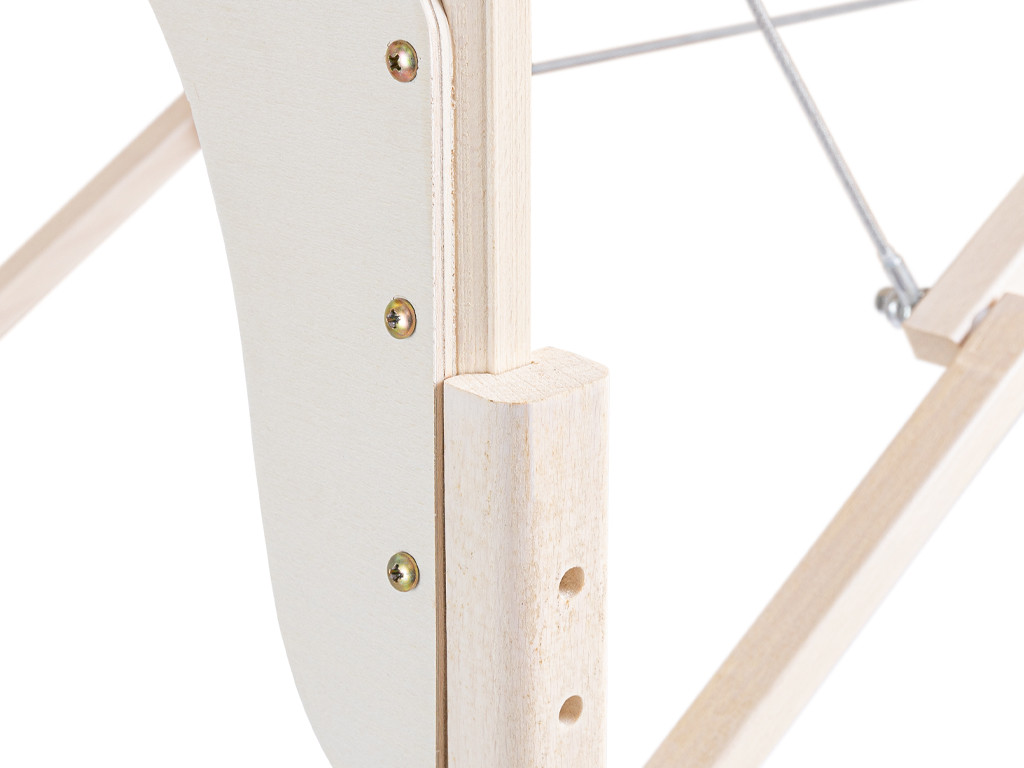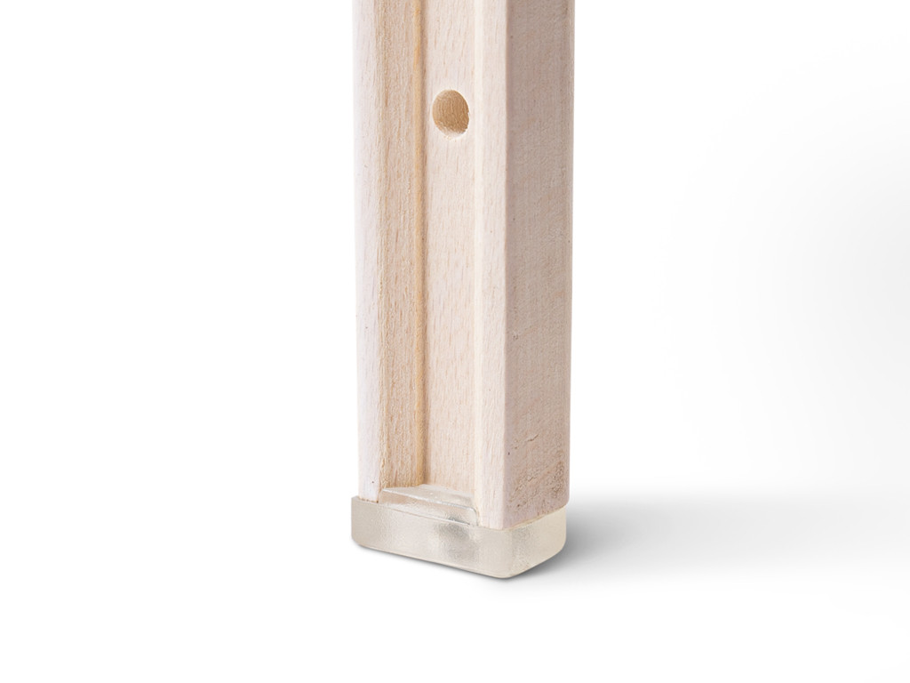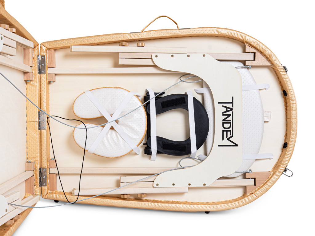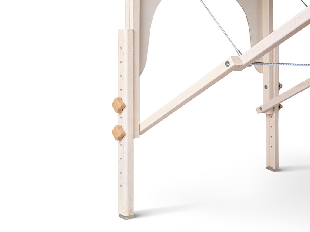 Dřevěná konstrukce s ocelovým výztužným systémem zaručuje bezpečnost při každém typu ošetření. Výška stolu je jednoduše nastavitelná v rozmezí od 63 do 88 cm, díky čemuž si ho každý terapeut může přizpůsobit podle vlastních potřeb a způsobu práce. Dvoudílná skládací konstrukce umožňuje rychlé rozložení a složení, což výrazně usnadňuje manipulaci zejména těm, kteří docházejí za klienty. Navzdory své robustnosti si stůl zachovává nízkou hmotnost pouze 14,4 kg, což spolu s praktickou taškou umožňuje pohodlné přenášení.