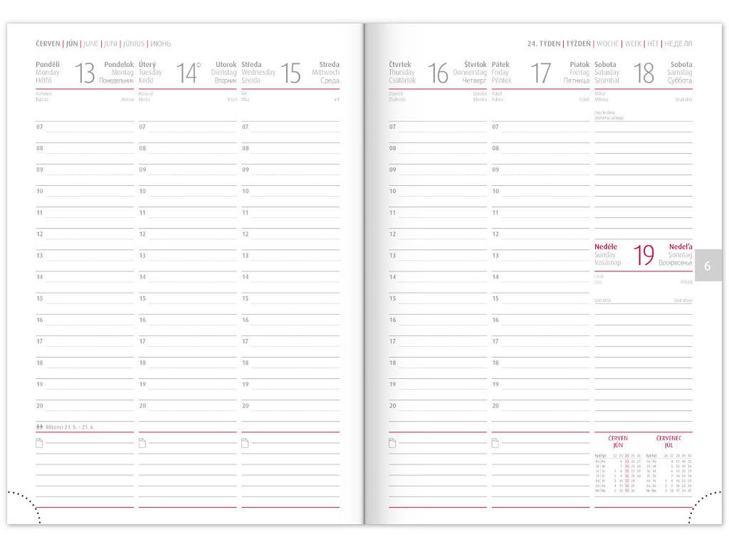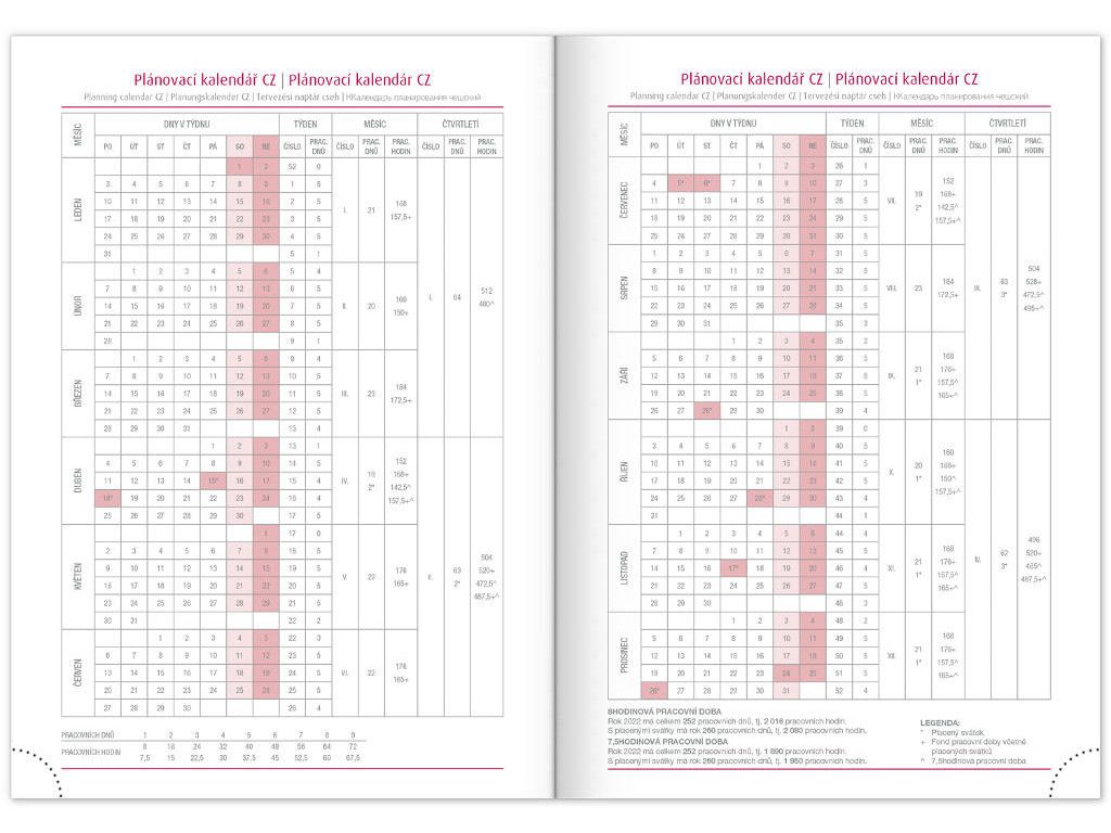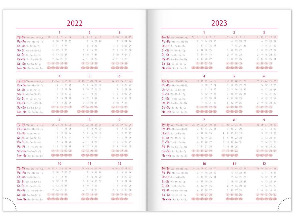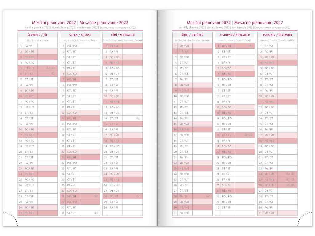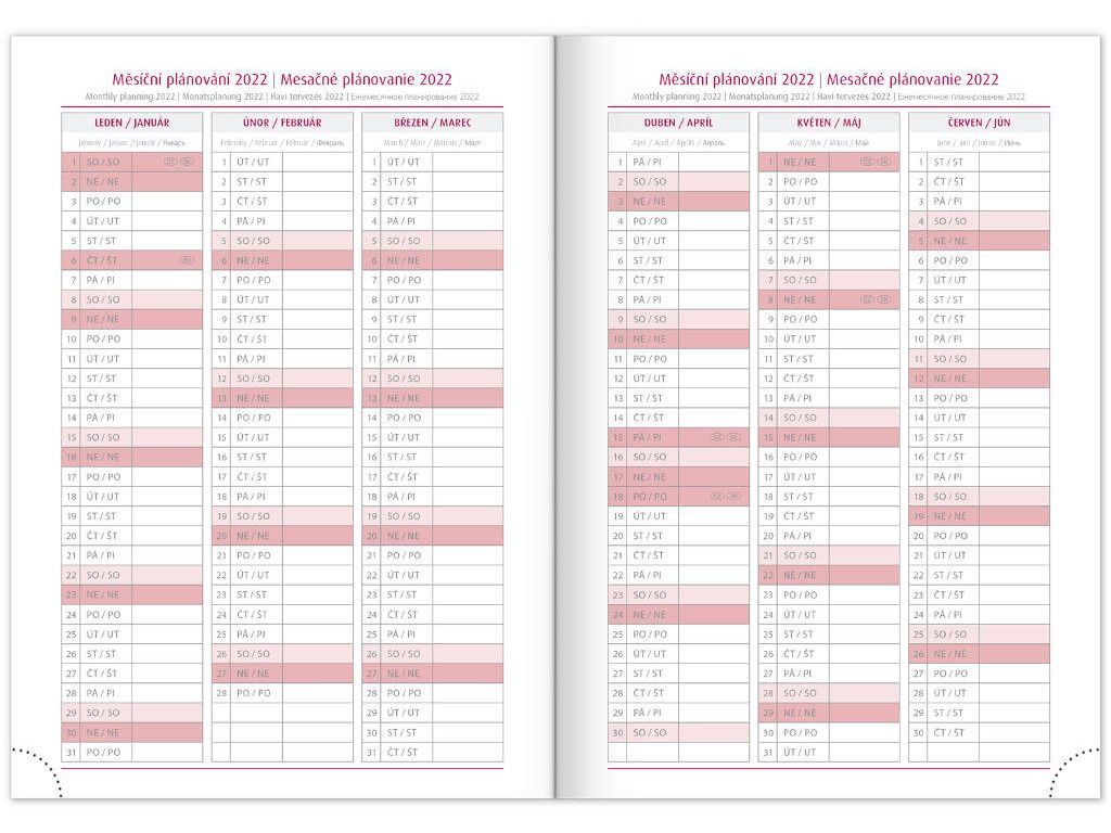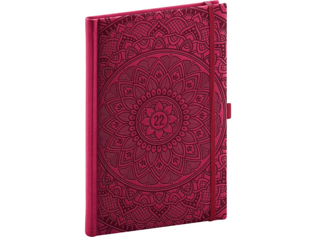 Týdenní diář na rok 2022 s motívem Mandala, s povrchem imitujícím kůži, v růžové barvě, ve formátu A5.