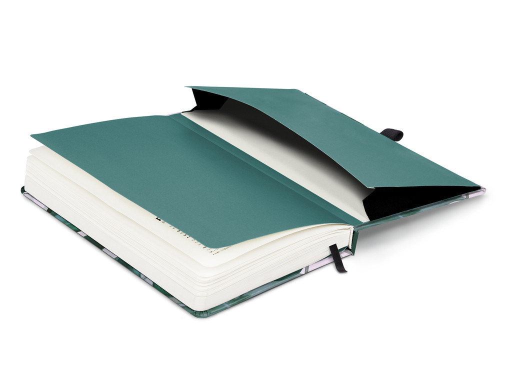 Týdenní diář v pevných deskách s uzavíráním na gumičku a s motivem pokojové rostliny monstery.
