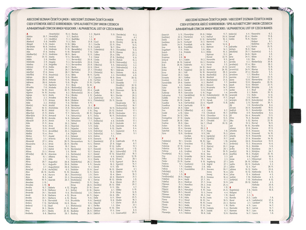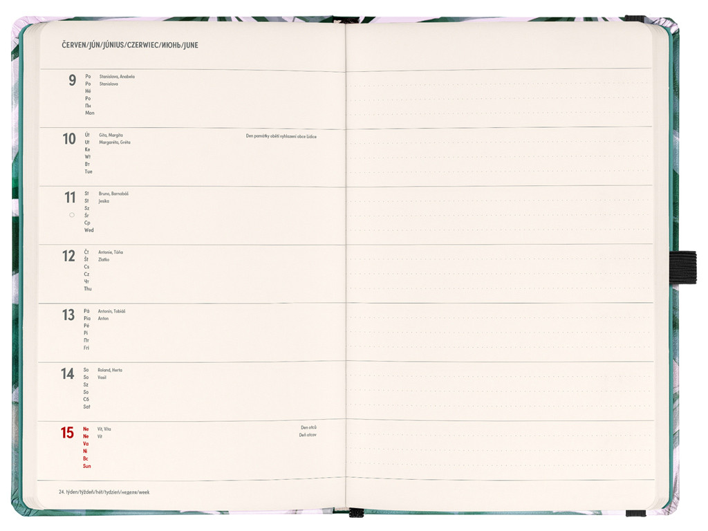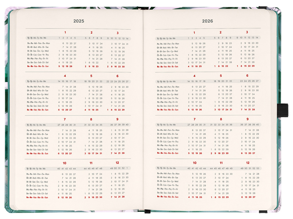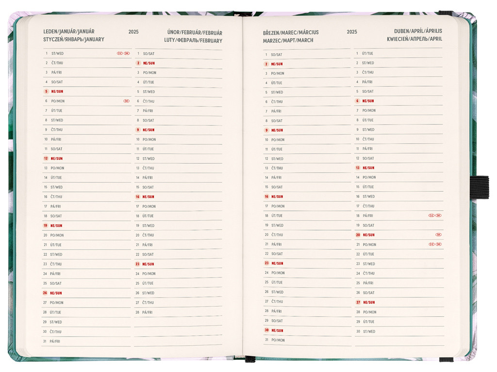 Šestijazyčný týdenní diář s uzavíráním na gumičku obsahuje přehled mezinárodních svátků, seznam českých a slovenských jmen, přehled roku 2025 a 2026, dodatečné stránky na poznámky, kapsičku na zadní předsádce a poutko na tužku.