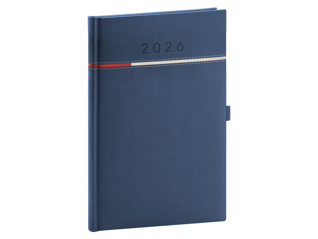 Týdenní diář Tomy 2026 v modré barvě. Osvědčené barvy doplňuje ražba letopočtu. Týdenní rozvrh s česko-slovenským kalendáriem a doplňkovou angličtinou, němčinou, maďarštinou a ruštinou.