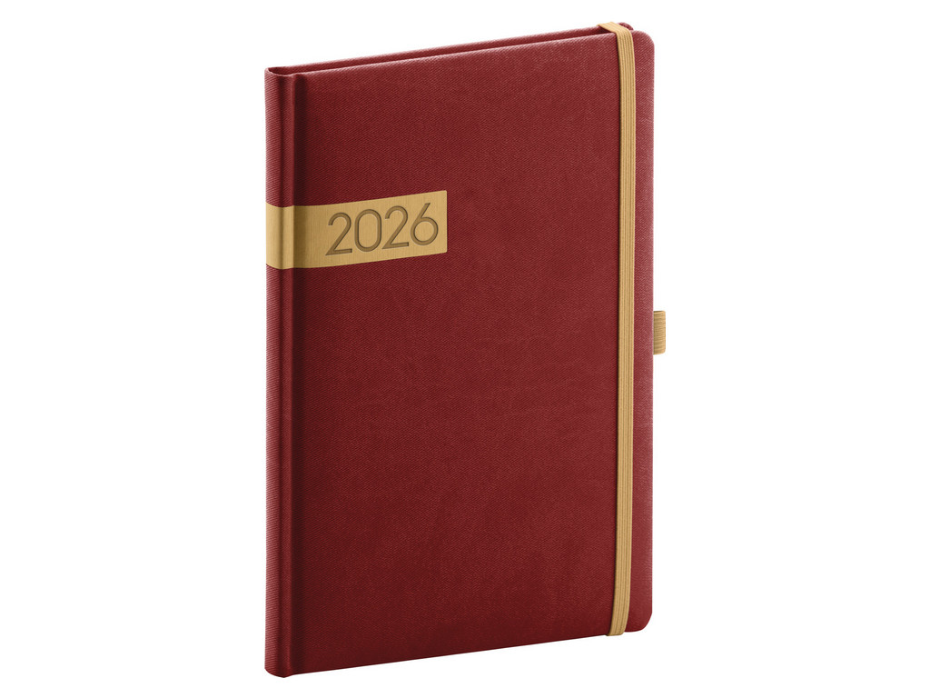 Týdenní diář Twill 2026 v bordové barvě. Osvědčené barvy doplňuje zlatá ražba letopočtu. Týdenní rozvrh s česko-slovenským kalendáriem a doplňkovou angličtinou, němčinou, maďarštinou a ruštinou.