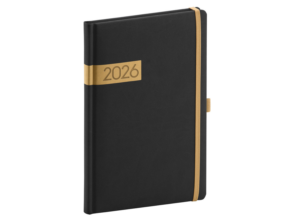 Týdenní diář Twill 2026 v černé barvě. Osvědčené barvy doplňuje zlatá ražba letopočtu. Týdenní rozvrh s česko-slovenským kalendáriem a doplňkovou angličtinou, němčinou, maďarštinou a ruštinou.