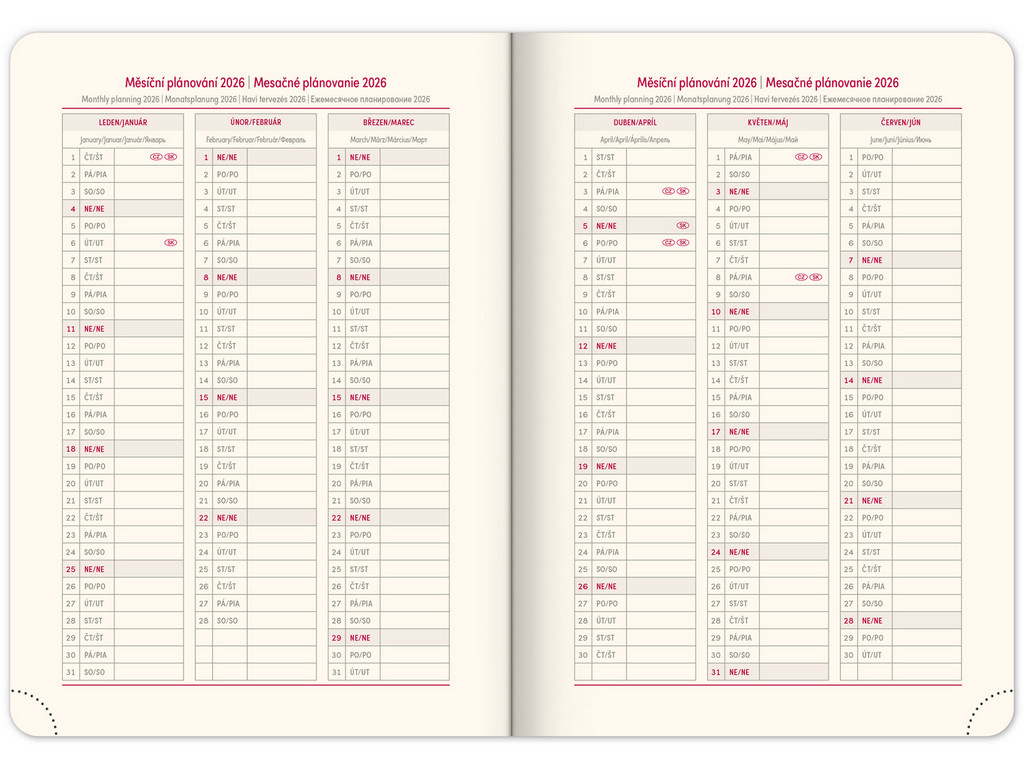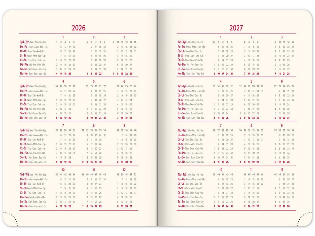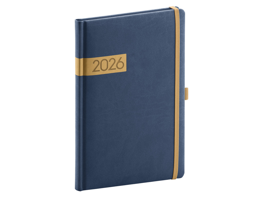 Týdenní diář Twill 2026 v modré barvě. Osvědčené barvy doplňuje zlatá ražba letopočtu. Týdenní rozvrh s česko-slovenským kalendáriem a doplňkovou angličtinou, němčinou, maďarštinou a ruštinou.